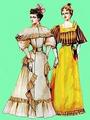 Платье дамы слева создано из шелка и кружев. Низ юбки имеет колоколообразную форму, верхняя юбка - простая и эффектная драпировка. Талию охватывает широкий ленточный пояс. Рукава - пышный вариант "бараньей ноги" очень широкие от плеча до локтя и узкие от локтя до запястья. Покрывающая плечи накидка застегивается спереди под центральной оборкой и скрепляется бантами с рукавами.